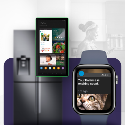The app connects with smart fridge for grocery reminders and sends personalized shopping recommendations on smart device.